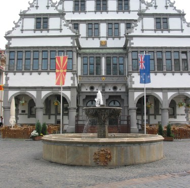 Das Paderborner Rathaus mit seiner prächtigen dreigiebligen Fassade entstand 1613-1620 und gilt als Paradebeispiel der Weserrenaissance. Im ersten Obergeschoss befindet sich der große Ratssaal, Arbeitssitz des Stadtparlaments und Stätte offizieller Empfänge und Feierlichkeiten, im Erdgeschoss das Standesamt. Der Ratskeller im Untergeschoss ist Restaurant und beliebter Treffpunkt für Bürger und Gäste der Stadt.